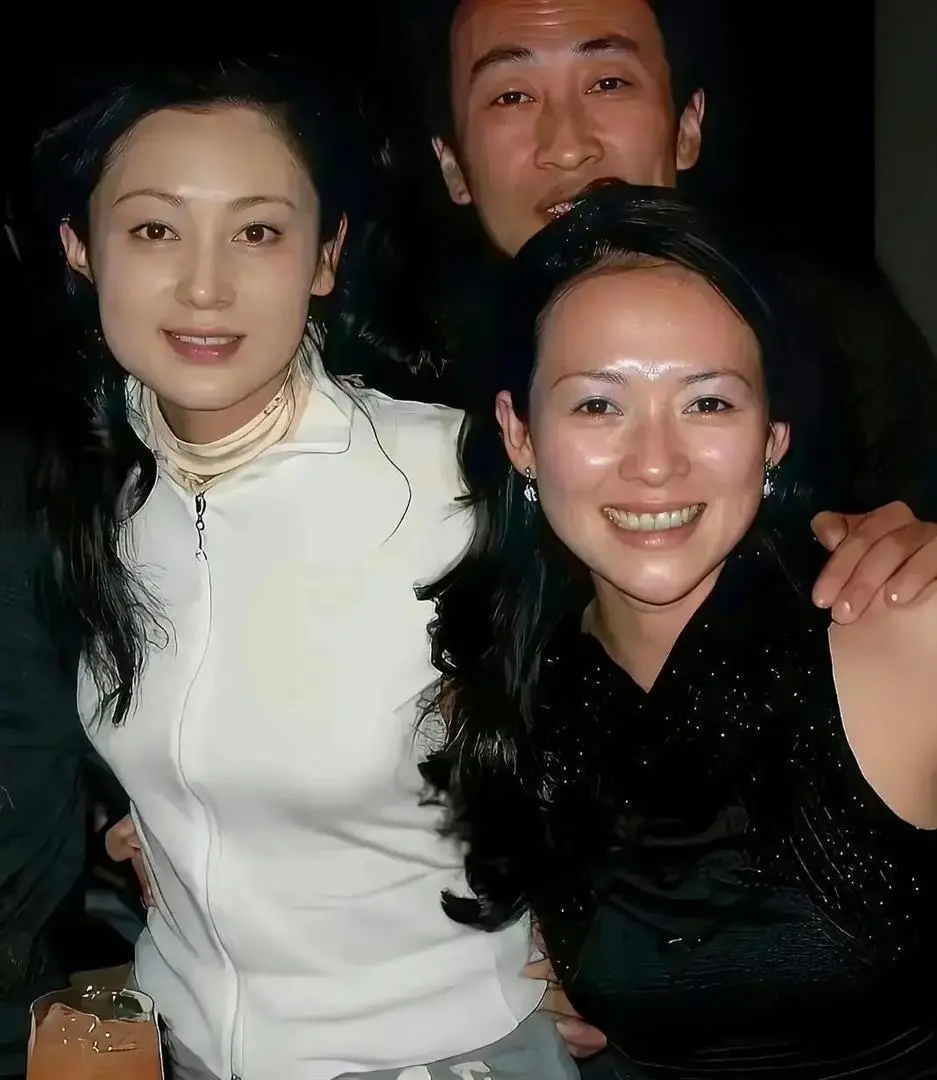再看右边的章子怡,那时候她还不是“国际章”,脸上还带着刚出道的婴儿肥。 她像是已经喝到位了,下巴微微扬着,那股子倔劲儿和得意全写在脸上。 这就是拍完《我的父亲母亲》还没拍《卧虎藏龙》时候的状态,身上还带着舞蹈演员的劲儿,但又没后来那种时刻紧绷的战斗感。