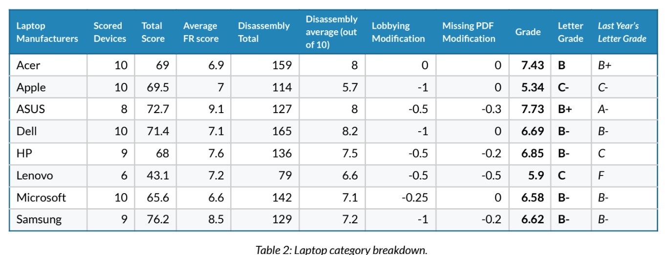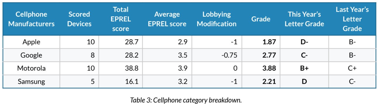 PIRG指出,每家公司的总评分由两个部分构成:一是每款设备在法国指数下的综合得分,二是剥离出“拆解难易度”单项之后的独立得分,然后再对企业在游说团体中的活动进行调整。如果厂商是TechNet或美国消费技术协会(CTA)成员,则每出现一次会员身份,整体成绩扣0.5分;相反,如果过去一年曾在公开听证中为“维修权”相关立法提供支持性证词,则每支持一次加0.25分。