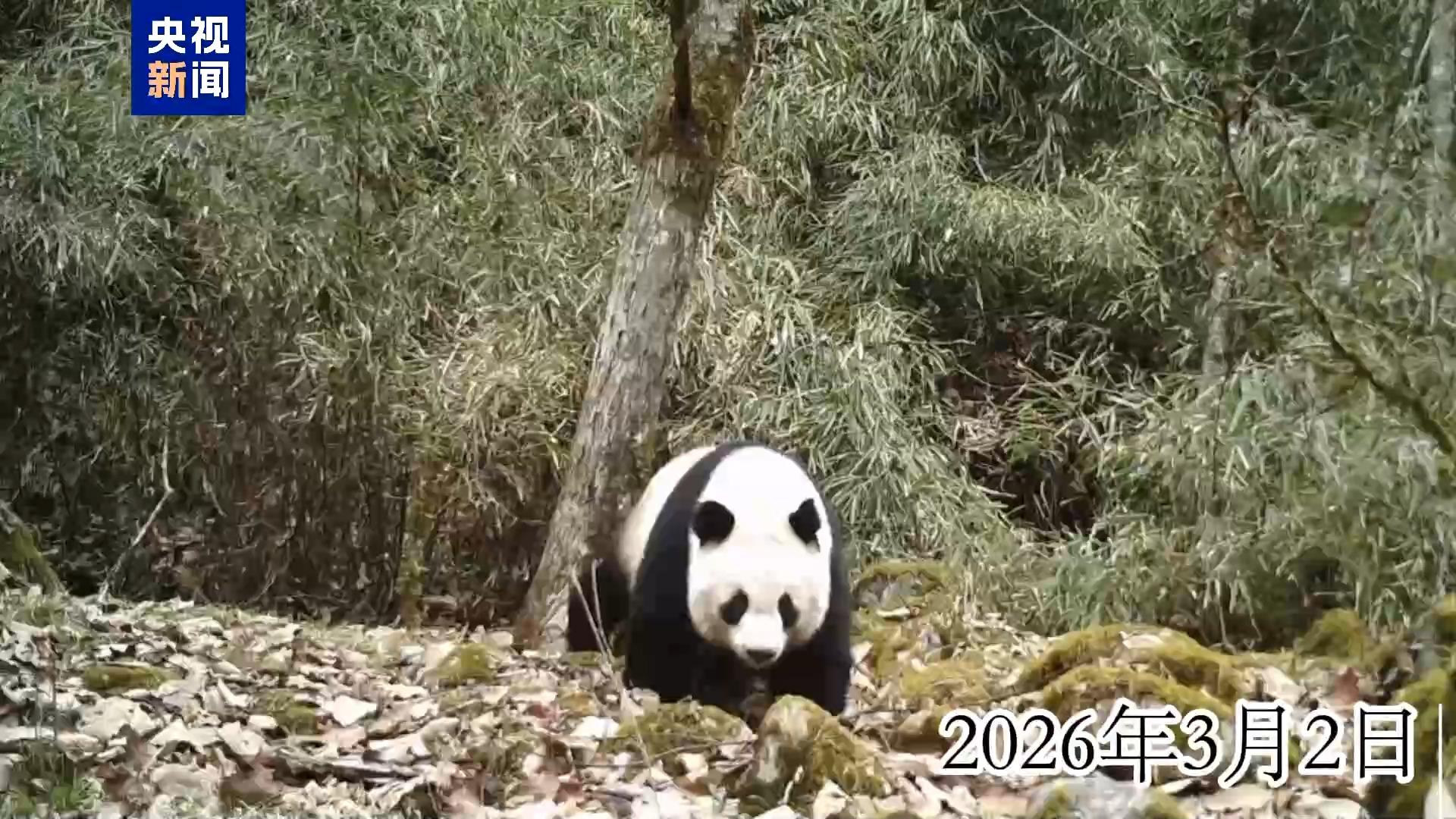 在2026年3月2日红外相机拍到的照片中,大熊猫正脸清晰,个体特征明显、身体状况良好。