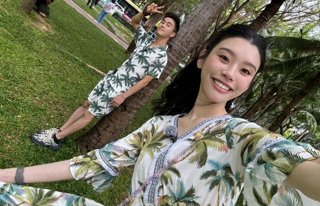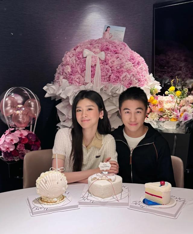 奚梦瑶先是晒出与何猷君合照,照片中身为寿星的奚梦瑶身着米白色针织短袖上衣,领口与袖口带有精致的拼色设计,搭配小巧耳饰,整体造型温柔优雅,她面带微笑,神情恬静。一旁何猷君则穿着黑色拉链外套,内搭白色T恤,神情温和,目光柔和地望向镜头,与奚梦瑶并肩而坐,展现出亲密无间的夫妻氛围。